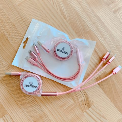 Type-C, lightning, microUSB が充電できるケーブルで、フルカラー印刷が可能です。本体色はグレー・ゴールド・ピンク・レッドからお選びいただけます。個包装は写真のとおり、背景がホワイトのビニール袋となります。Swag Studio 人気no.1商品です。